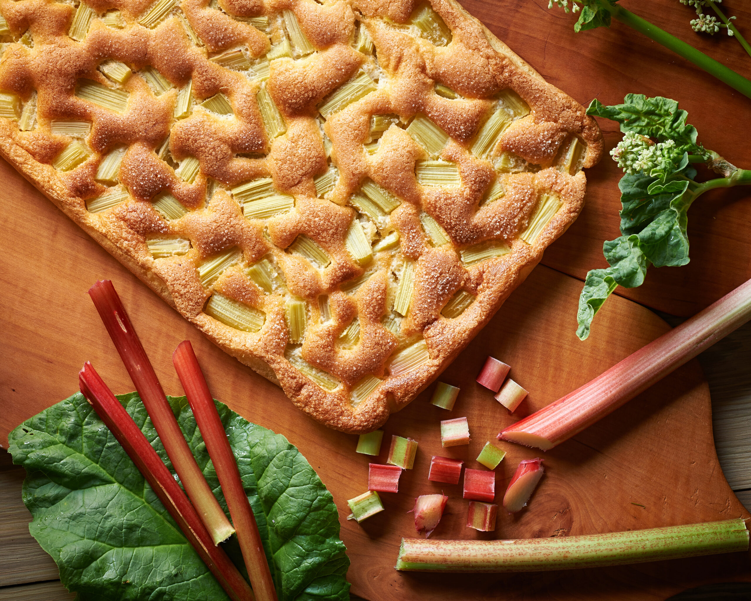 Maso vlijemo v pekač, ki smo ga obložili s peki papirjem. Po vrhu mase natrosimo očiščeno narezano rabarbaro in jo rahlo potisnemo v testo.
